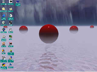 so I thort I'd re-send me desktop. It's a picture I molished in POV-Ray for Winders of some red billiard balls floating above a misty lake wiv an angry sky in the background. No, I don't know what they're doing there either.TTFN. |