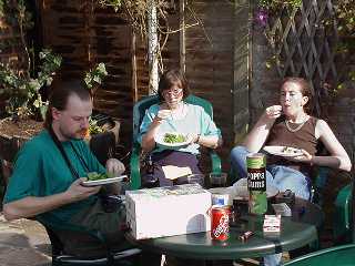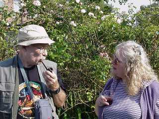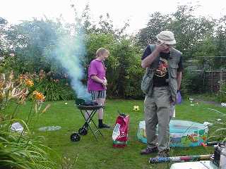 Helen lights the BBQ. It looks like Bob has something in his eye, yes it's his finger |