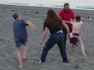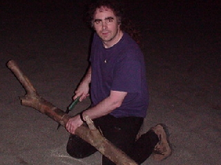After the ice cream we went down to the beach in Austin's Lard rover. Unfortunately he ran Catherine over and she is in the recovery position. The industrial strength BBQ (detachable shorts, can be hfred as legs) is smoking in the distance. |