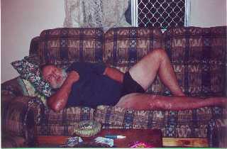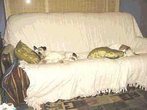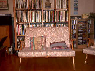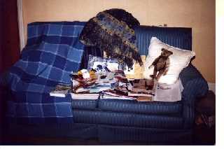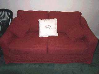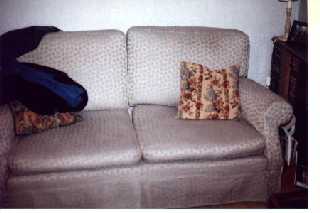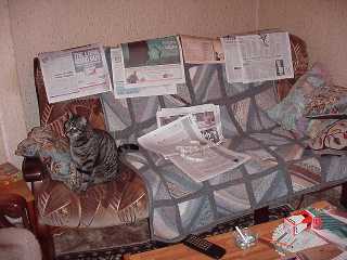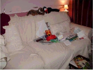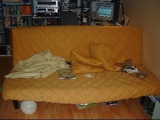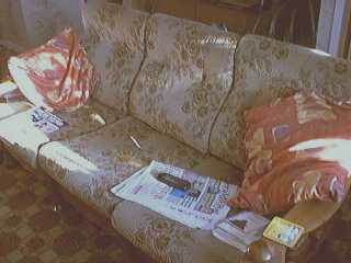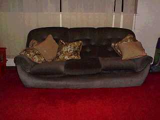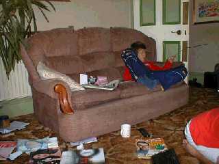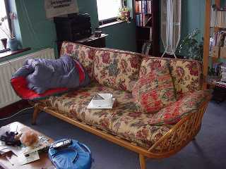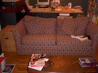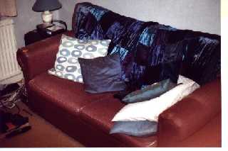 [coj] Bob, howzabout a piccie of the back of yours ? [(Bob] I haven't been able to sneak up behind it yet. Meanwhile here's a picture of the front. Actually it's more of a settee than a sofa, but you will note it's about to assimilate a pen, a Nude Scientist, the local paper, the TV remote control, some Xmas cards, two cushions and a rather sticky coaster. |